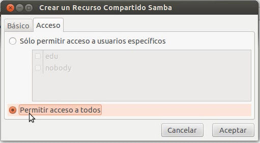 escritura a los otros, ya que el usuario invitado de Samba no es un usuario definido del sistema y se