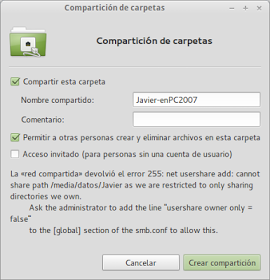 Cuando pinché en "Crear compartición" me saltó un mensaje de error, que decía que