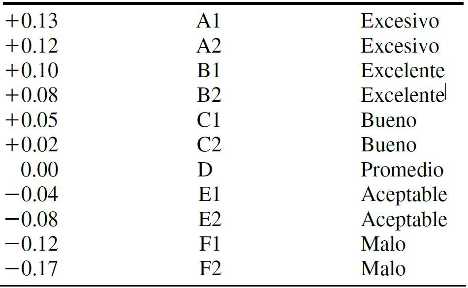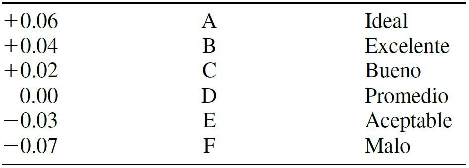 Ideal, excelente, bueno, promedio, aceptable y malo