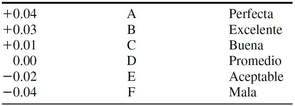 Perfecta, excelente, buena, promedio, aceptable y mala