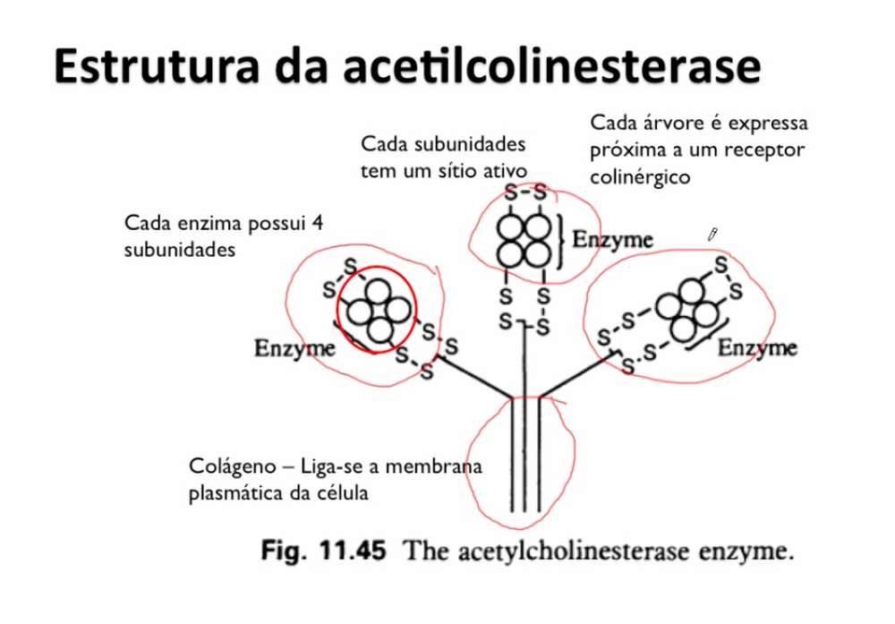 Cada AChE possui 4 subunidades (4 cadeias de polipeptídicas e cada cadeira possui um sítio ativo para a ACh), cada enzima é capaz de hidrolisar 4 ACh ao mesmo tempo.