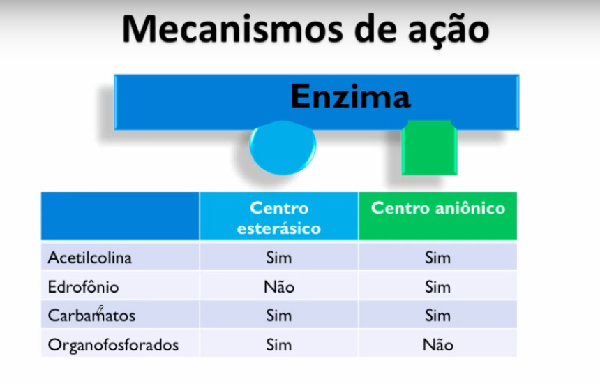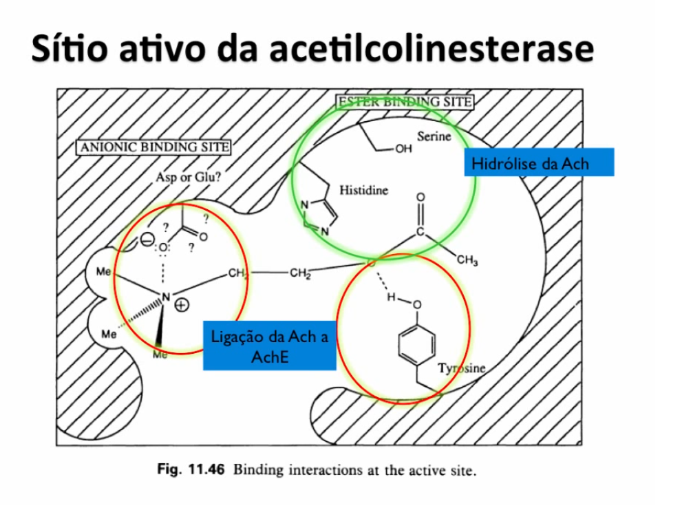 acetilcolinesterase. Possui sítio nucleofílico que interage com o sítio aniônico fosforilado da
