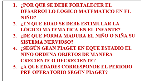 el pensamiento lógico - matemático es el que desarrolla el niño de acuerdo a las experiencias que el obtenga al