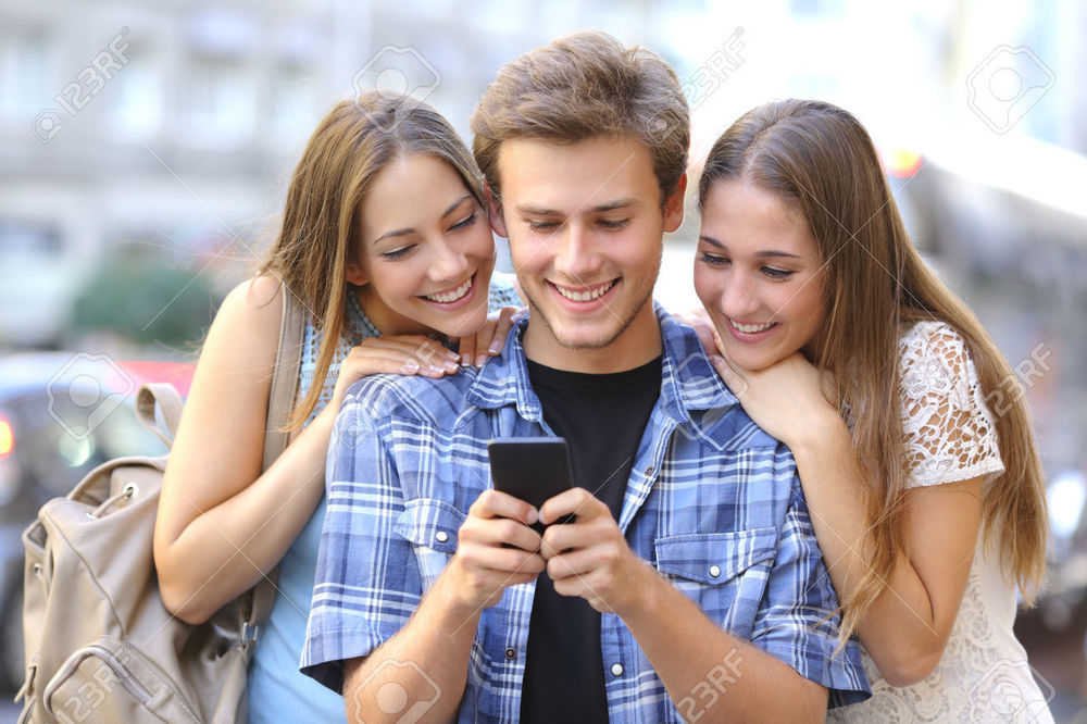 50566203 Amigos Divertidos Compartiendo Medios De Comunicaci N En Un Tel Fono Inteligente En La Calle Foto De Archivo (image/jpeg)