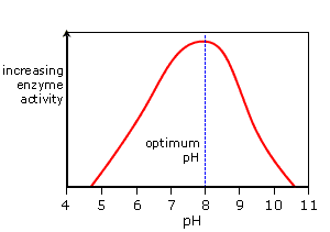 Denature=enzyme loses shape of active site when heated above 45°/exposed to extreme pH