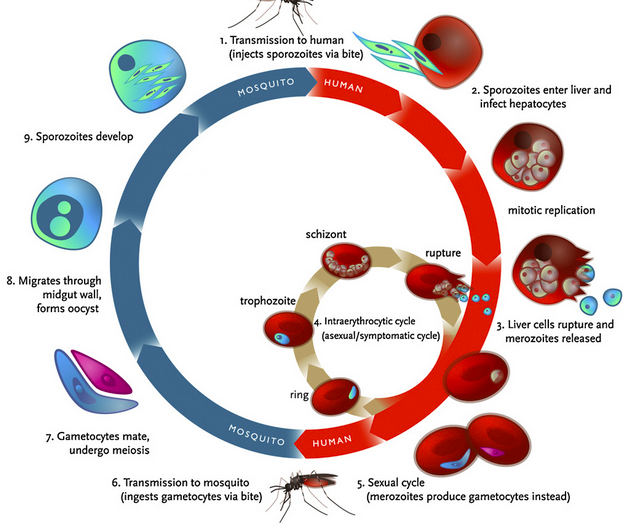 malaria fevers are cyclical; synchronized with the bursting of merozoites into bloodstream