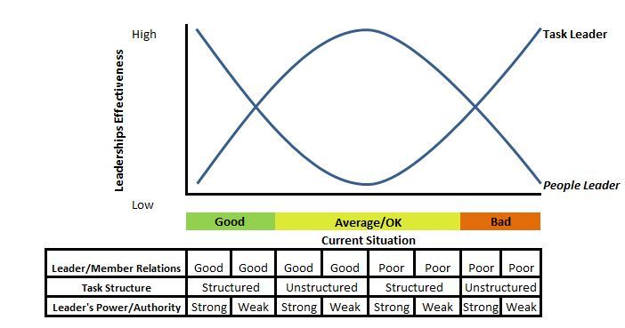 the effectiveness of each depends on the favourableness of the situation which is dependant on: