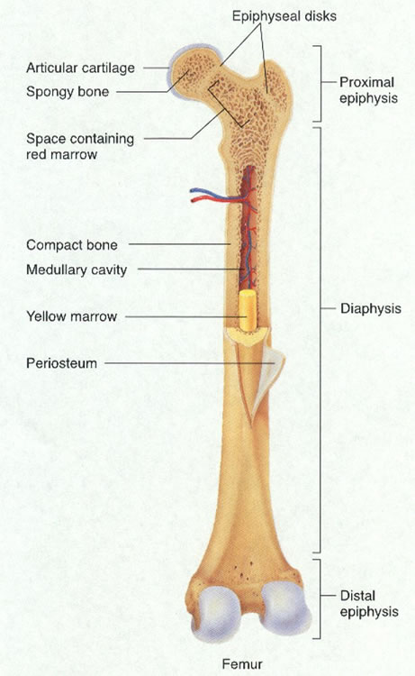 1) Diáfisis 2) Epífisis 3) Metáfisis 4) Periostio 5) Agujero nutricio 6) Cavidad medular 7) Endostio 8) Fisis (cartílago de crecimiento)