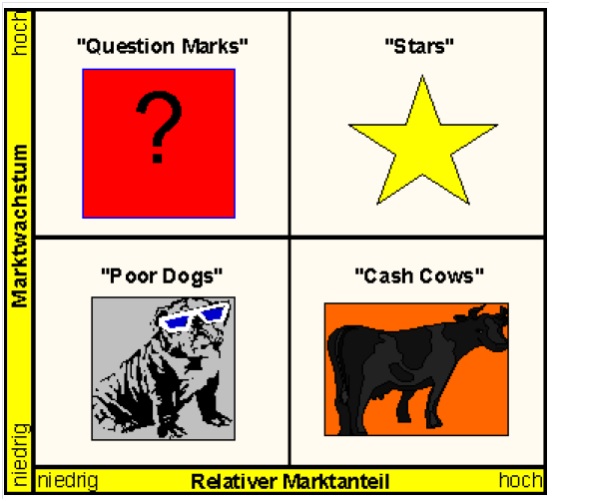 werden in einen zweidimensionalen Raster, die Marktwachstum-Marktanteil-Matrix eingeordnet