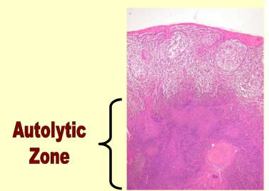 Tissue self-digestion due to release of intracellular lytic enzymes