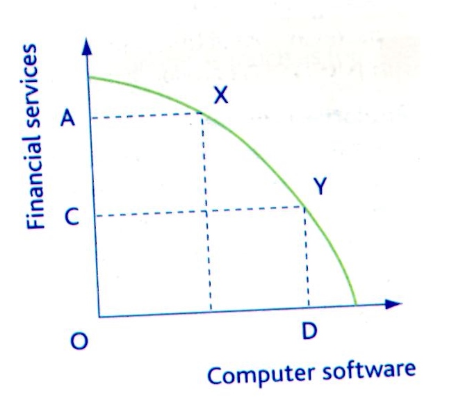 e.g. to shift production from X to Y you would produce OD of computer software but must give up AC of financial services
