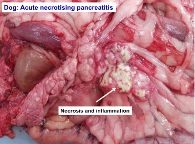 Necrosis of the pancreas, adjacent connective tissues & abdominal fat