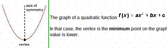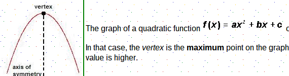 Maximum: Leading coefficient of the function a < 0 (negative), we have a maximum point, namely the vertex. The maximum value of the function is the y-coordinate of the vertex point.