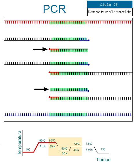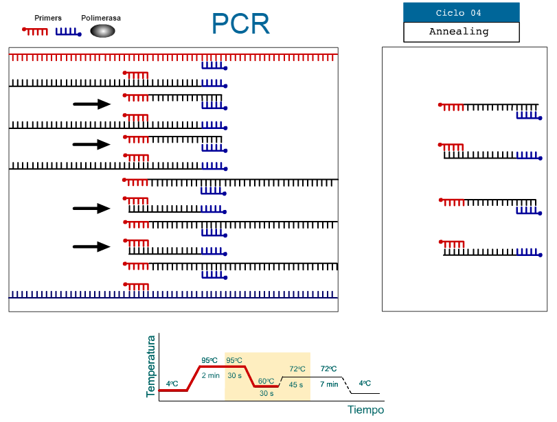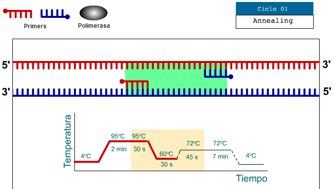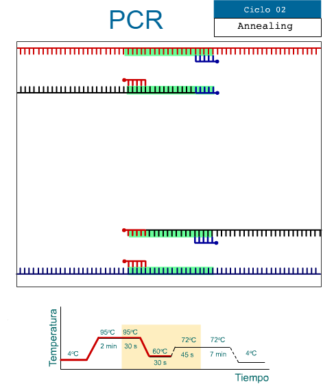 A los 3 min del ADN de Diana se unen las primeras Primers. La temperatura varia en funcion de la composicion de bases de los Primer (50-60 C)