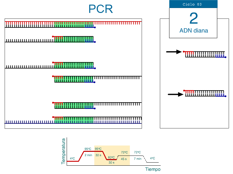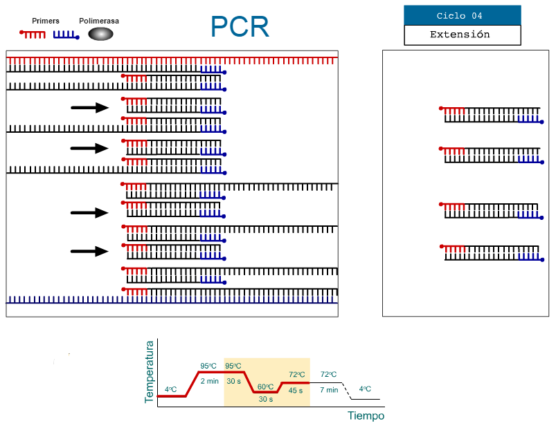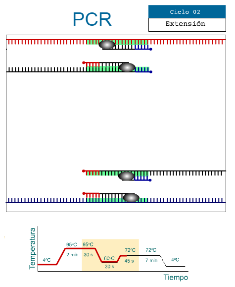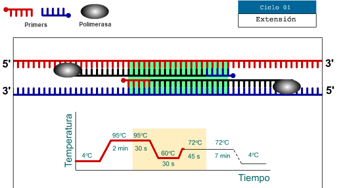 La Taq ADN polimerasa sintetiza la cadena complementaria a partir del primer. Este primer ciclo sobrepasa los limites de la secuencia Diana.