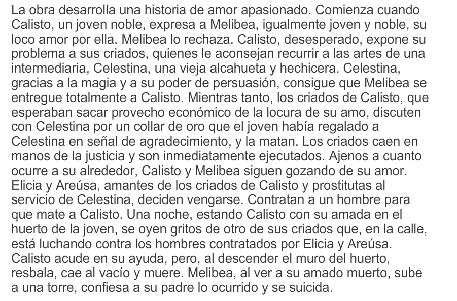 Trata de una historia de amor apasionado entre dos jóvenes nobles llamados Calisto y Melibea