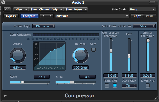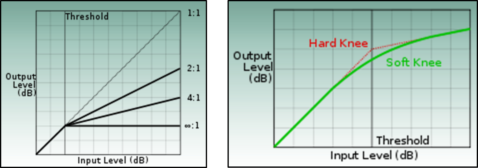 Knee – sets how the compressor reacts to signals once the threshold is passed. Hard Knee settings