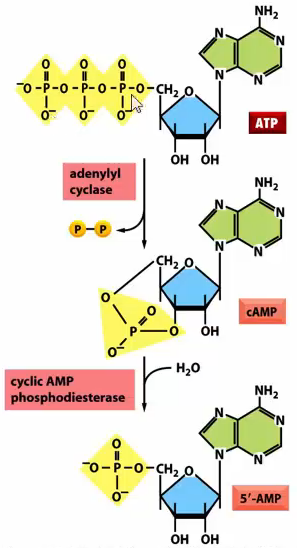 The adenylyl cyclase removes two phosphates from the ATP forming cAMP