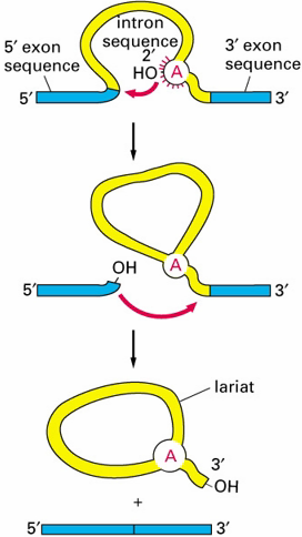 The 5 prime -OH attackes 3 prime intron end of intron and a lariat forms