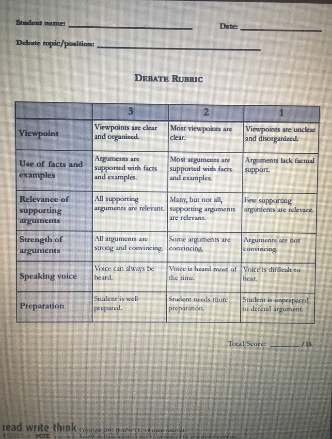 Assessment: Debate Rubric/Self and Peer Assessment: