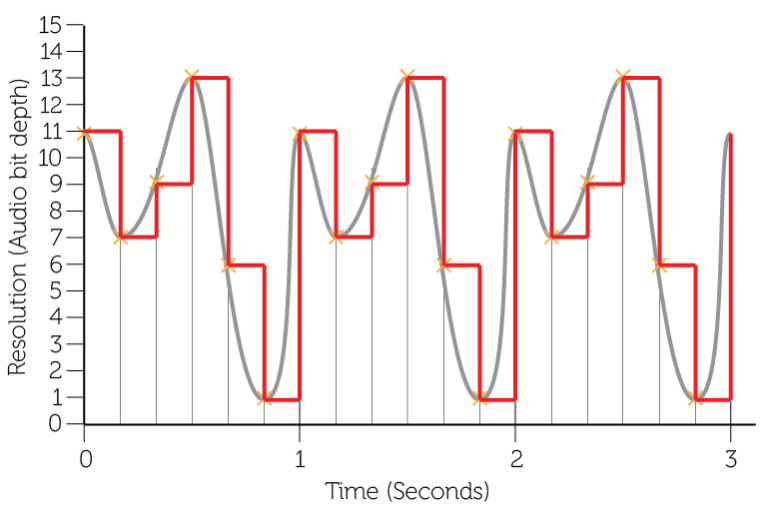 Recording quality improves: the more frequently we sample the sound and the more accurately we record the wave height