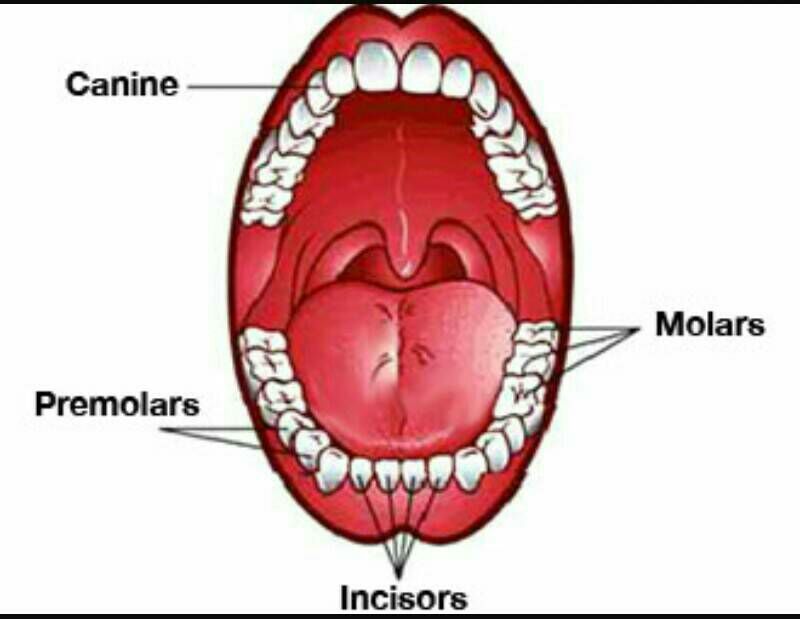 Teeth 4 incisors 2 Canines Cutting/Tearing food. 10 Molars Grinding Food.
