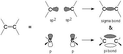 Because bonding angle is 120 degrees, this means the shape of ethane for example, is like two trigonal planars facing each other with an overlap of one prong.
