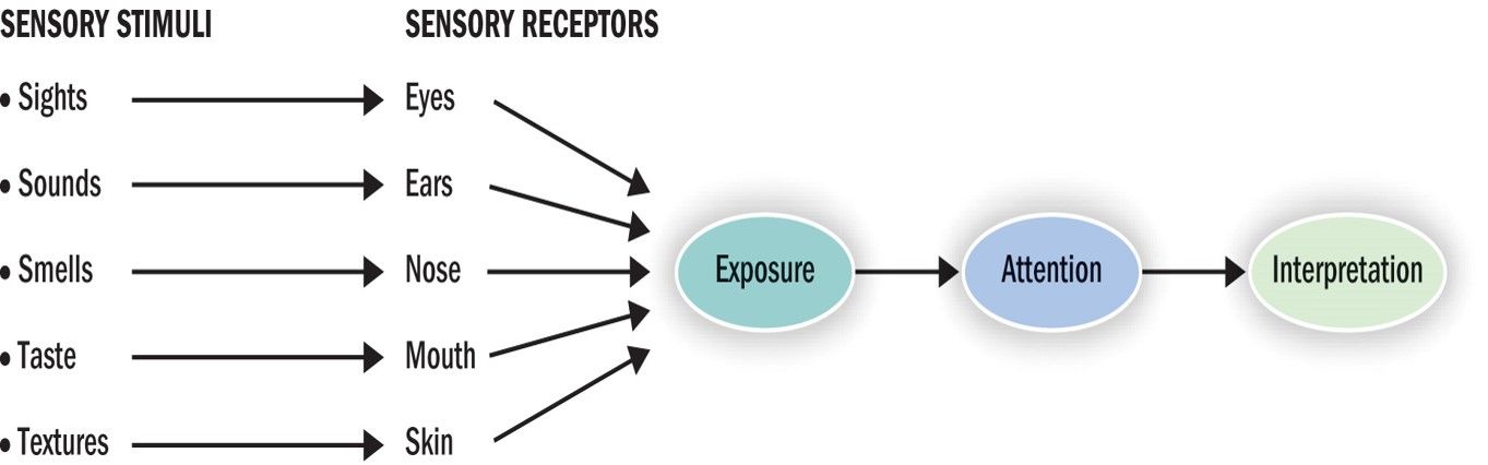 Perceptual Process (Sensory stimuli, sensory receptors -> exposure, attention, interpretation