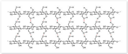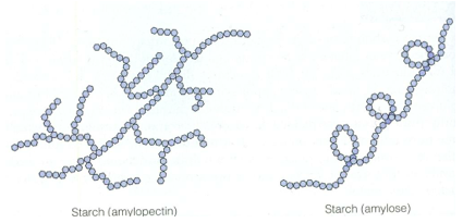 Unbranched chain of A-Glucose. Angles of bonds give it coil structure