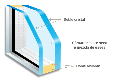 Está formado por dos o más lunas separadas entre sí por cámaras de aire deshidratado resultando un eficaz aislante, proporcionando confort térmico pues elimina el efectopared fría en zonas cercanas al cristal.