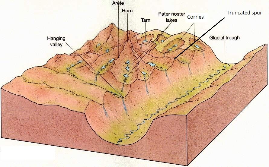 A diagram to show features of glacial erosion. A Pater noster lake is one of a series of glacial lakes