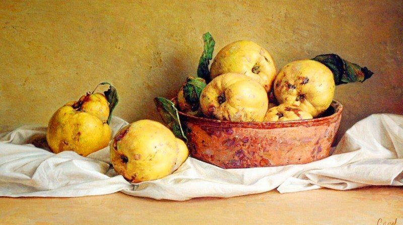 como vasos jarrones, libros, platos, frutas, utensilios de