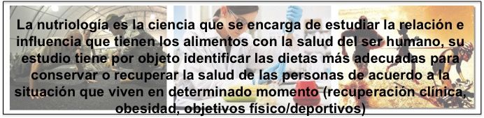 La nutriología es la ciencia que se encarga de estudiar la relación e influencia que tienen los alimentos con la salud del ser humano, su estudio tiene por objeto identificar las dietas más adecuadas para conservar o recuperar la salud de las personas de acuerdo a la situación que viven en determinado momento (recuperación clínica, obesidad, objetivos físico/deportivos)