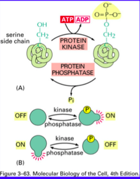 Shows how protein phosphorylation may be increasing or decreasing activity of even catalysis of a different reaction