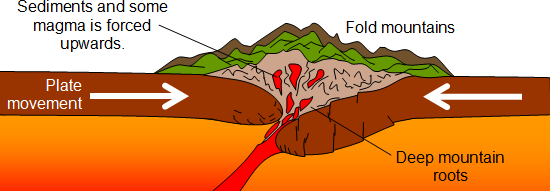 Fold mountains - during subduction, one plate is melted and increased pressure then leads to volcanoes forming. Once the chamber is empty. The volcano becomes inactive and thus becomes a mountain.