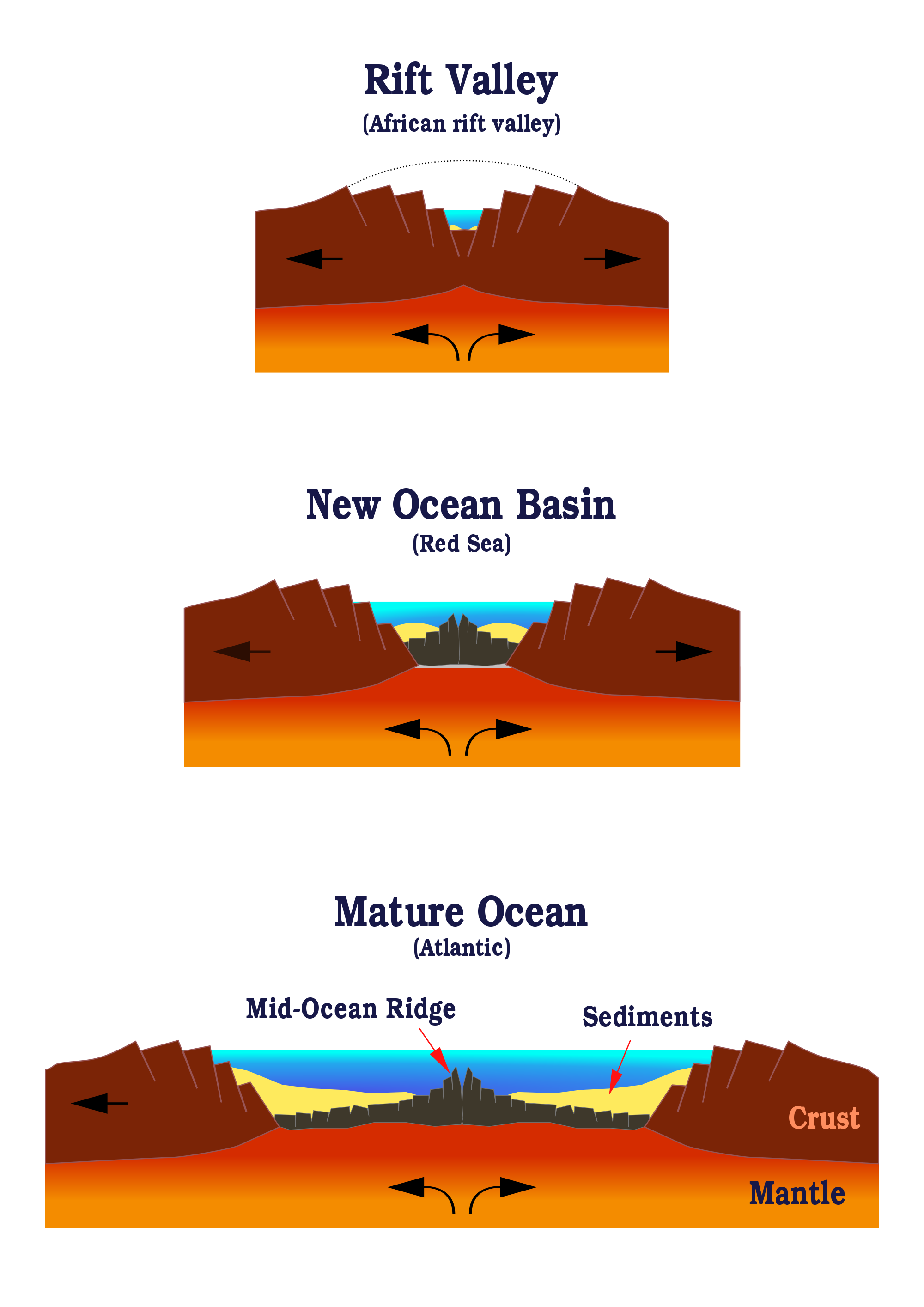 Rift Valley - the land mass fractures due to heat and rifts appart, central parts of land drop and form rift valleys.