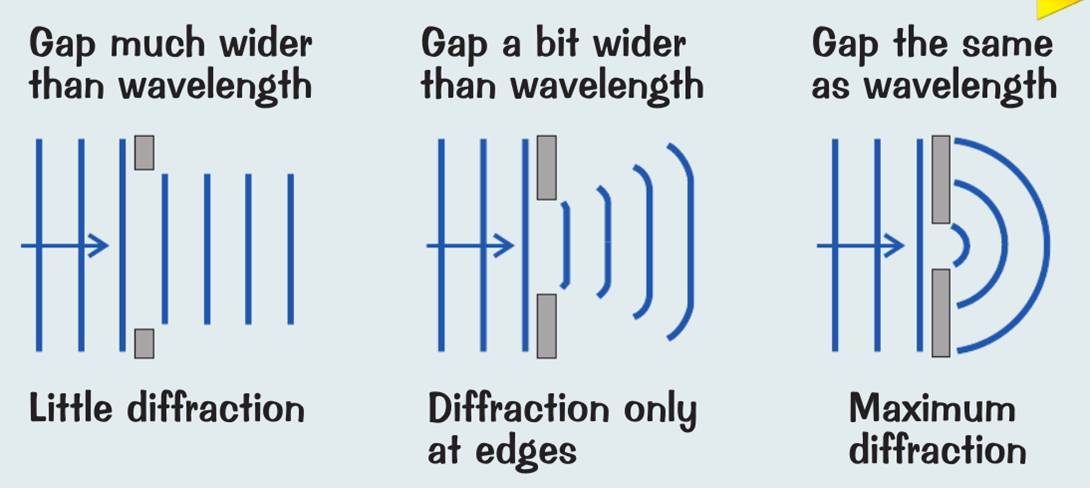 Waves spreading out when at the edges when they pass through a gap or pass an obstacle