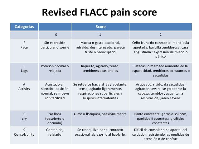 Escala FLACC para pacientes de 1 mes a 3 años. En la escala: