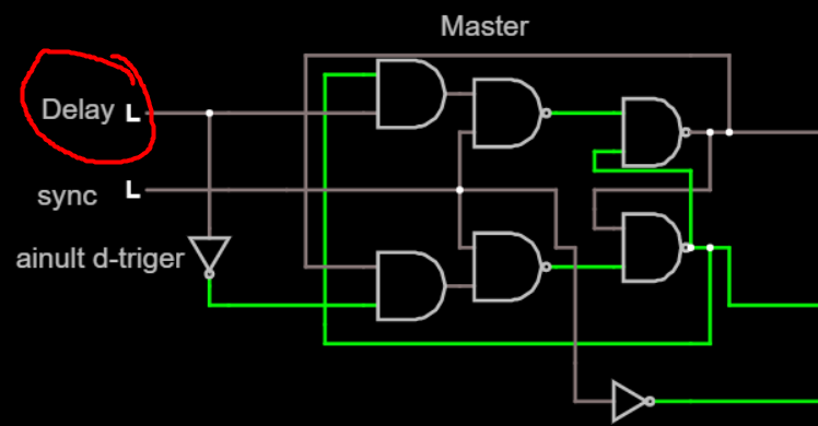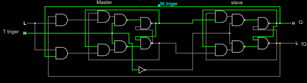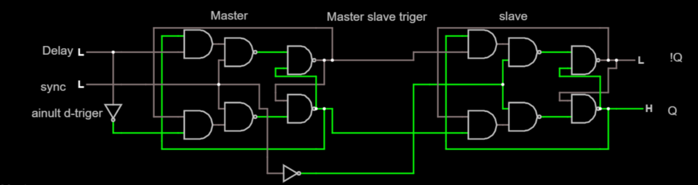 frondiga sünkroniseeritava D trigeri baasil, mille ette koostatakse loogikaskeem, mis paneb ta käituma nagu JK trigeri