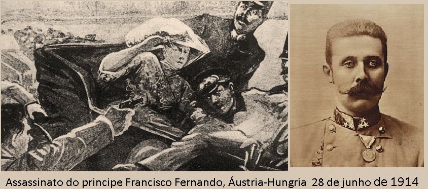 Estopim da Primeira Grande Guerra. Em 28 de Junho de 1914, o arquiduque Francisco Ferdinando herdeiro do trono austríaco, e sua esposa, foram assassinados. Assassino Gravillo Princip, pertencia a uma organização nacionalista que tinha apoio da Rússia. A Áustria reagiu militarmente contra a Sérvia (ligada ao governo Russo ), e diante das alianças politicas, as demais potencias entraram no conflito, dando inicio a 1º Grande Guerra ou a tambem chamada 1º Guerra Mundial