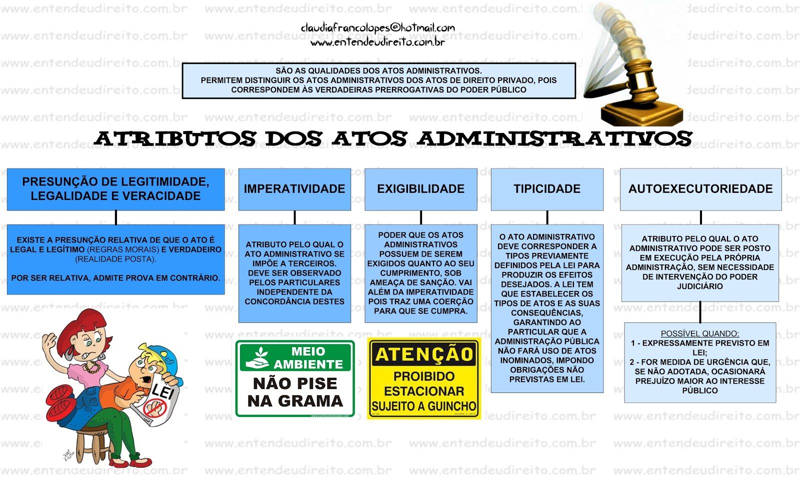 Atributos dos Atos Administrativos Presunção de Legitimidade: Presume-se válido desde o início, até prova em contrário. Supremacia do Interesse Público - Imediata execução. Presunção relativa - permite prova em contrário (Juris Tantun); Transfere o ônus da prova ao particular; Presunção de Verdade/Veracidade: certeza dos fatos; Presunção de Legalidade/Legitimidade: certeza dos direitos. Ex: Certidão para Aposentadoria.Imperatividade: Os Ato da AP se impõe sobre os administrados, mesmo contra a vontade destes. No entanto, nem todos os atos são imperativos. Ex: inscrição em Conc. Público. Atos não imperativos: Atos negociais, ou declaratórios/enunciativos. Tb chamado de Poder Extroverso. A imperatividade existe apenas nos atos da AP que impõem obrigações. Ex: bloqueio de uma rua. Autoexecutoriedade: A AP pode executar seus atos administrativos, independentemente do Poder Judiciário/Ordem Judicial; Só existe autoexecutoriedade se expresso/previsto em Lei (Expressa ou Implícita), ou se for essencial á manutenção do interesse público/paz social; Ato não Autoexecutável: desapropriação, execução de dívida pública. Exigibilidade: meio indireto de execução da vontade do estado. Ex: multa por estacionar em local não permitido;Executoriedade: meio direto de execução da vontade do estado. ex: carro guinchado por estacionar em local proibido.Tipicidade:Os atos administrativos devem corresponder as figuras (tipos) previamente definidos em lei, como aptos a produzir determinados efeitos jurídicos.