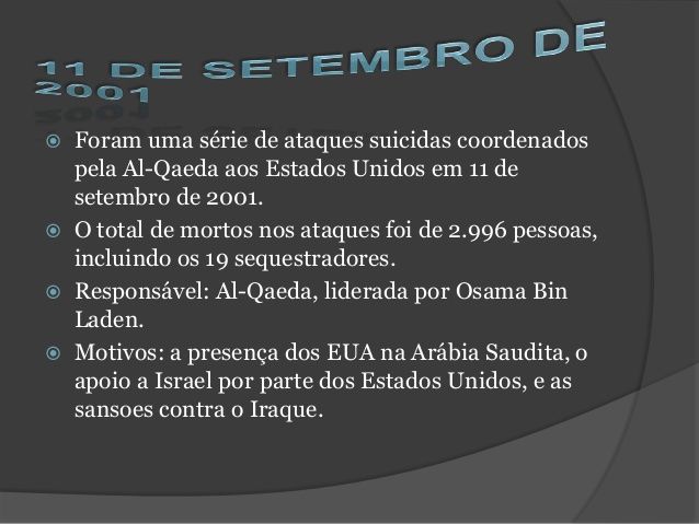 No Brasil, a Comissão de Relações Exteriores e Defesa Nacional (CREDEN) classifica como ato terrorista: “Ato com motivação política ou religiosa que emprega a força ou a violência física ou psicológica, para infundir terror, intimidade ou coagindo as instituições nacionais, a população ou um segmento da sociedade”. Os atentados terroristas de 11 de setembro de 2001, executados pelo grupo fundamentalista islâmico denominado Al-Qaeda, representaram o início de uma nova fase da História mundial. A maneira como foram organizados e executados mostrou como é possível atingir, tão profundamente, “o coração” da maior potência do mundo de uma maneira simples e eficiente. Como uma organização não-governamental, clandestina, que tinha como base o interior do Afeganistão, conseguiu tanto êxito?Sem dúvida, depois dos atentados terroristas de 11 de setembro de 2001, o contexto político-diplomático internacional se modificou. Após a ação da Al-Qaeda, os EUA desenvolveram uma nova doutrina de ação de defesa baseada na guerra preventiva, podendo agir de maneira unilateral em qualquer lugar onde, ao seu ver, houver indícios de ações contra a segurança interna do país. Os atentados de 11 de setembro acabaram por dar respaldo ao domínio da tendência política conservadora republicana nas ações do governo Bush, criando assim uma postura diplomática inflexível e conservadora dentro do projeto governamental de “guerra contra o terror”. Outro ponto importante foi que, depois dos atentados de 11 de setembro de 2001, o mundo assistiu ao enfraquecimento da ONU, frente às ações unilaterais do governo norte-americano. Com isso, os EUA passaram por cima da Organização das Nações Unidas (ONU), tornando-a, de fato, uma instituição inoperante frente aos acontecimentos mundiais. Após os atentados de 11 de setembro, foram duas guerras preventivas executadas pelo EUA sem aprovação da ONU: Afeganistão (2002) e Iraque (2003). Por outro lado, a estrutura organizacional da Al-Qaeda atua em células organizacionais independentes, distribuídas pelo mundo. A Al-Qaeda disseminou sua ideologia e sua metodologia operacional usando os meios globalizados de comunicação, de forma a tornar-se uma estrutura descentralizada com células operacionais em várias partes do mundo.Os ataques realizados em Madrid (11 de março de 2004) e em Londres (7 de julho de 2005) mostraram essa flexibilidade e revelaram a impossibilidade de se antever um ataque terrorista planejado pela Al-Qaeda.Em maio de 2011, após quase dez anos de ocupação militar e aproximadamente US$ 400 bilhões gastos, o principal objetivo da guerra foi atingido, o líder da Al Qaeda e organizador dos atentados de 11 de setembro, Osama Bin Laden, foi localizado e morto em um ataque militar na cidade de Abbottabad no Paquistão. O sucesso da operação provocou uma onda diversificada de reações pelo mundo, desde protestos populares realizados no próprio Paquistão até congratulações por parte de chefes de estado de vários pontos do mundo ao presidente Barack Obama. Certamente a Al-Qaeda não deixará de atuar e o risco de um atentado deverá ser tratado como iminenteApós uma década dos atentados de 11 de setembro, o mundo ainda procura uma solução definitiva para os problemas ligados ao terrorismo que envolvem aspectos políticos, sociais e econômicos. Sendo assim, o terrorismo acabou tornando-se o principal fenômeno global do início do século XXI, marcando permanentemente o início de uma nova era na história mundial.