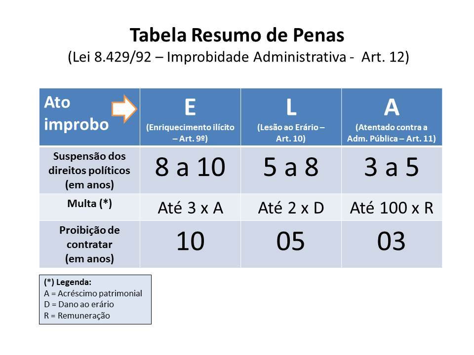 Tabela resumo do Art. 12 da Lei 8.429/92 que indica as penas para os atos de improbidade administrativa de que trata esta Lei.