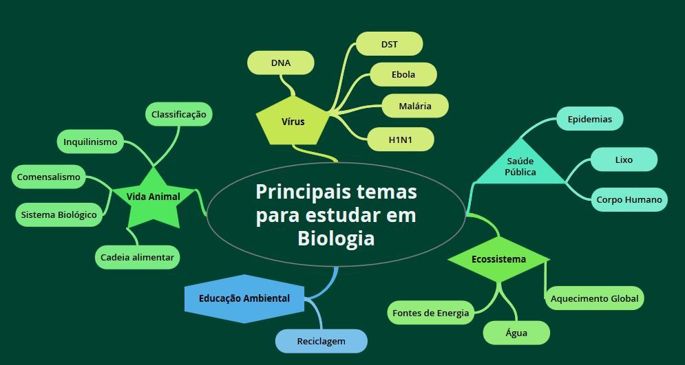 Problemas AmbientaisControle biológico de pragas, correlação entre desmatamento e a febre amarela, transformação do lixo orgânico, problemas ambientais.Fisiologia e GenéticaImpactos ambientais, ecossistemas, questões de genética, fisiologia humana e evolução das espécies.BiomasBiomas brasileiros, controladores biológicos, processo de fotossíntese, pressão sanguínea, sistema imunológico.EcossistemasEcossistemas naturais, níveis de compostos nitrogenados, queima de combustível, ácido sulfúrico e precipitação ácida, alimentos transgênicos, microrganismos decompositores.Biologia EvolutivaCombinação de cromossomos, processo de evolução biológica, origem da vida (hipóteses autotrófica e heterotrófica), camada de ozônio, evolução da vida.