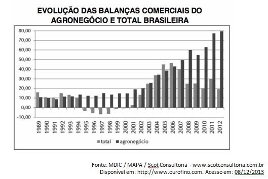 A análise da balança comercial brasileira, no período mostrado no gráfico, permite inferir (afirmar) que o agronegócio é responsável pelo maior volume de exportações do Brasil. Você sabe o que come? Para especialistas, a segurança alimentar não é garantida no Brasil, que figura entre um dos maiores consumidores mundiais de agrotóxicos. Diante do cenário onde, por ano, têm sido utilizadas, em solos brasileiros, milhares de toneladas de agrotóxicos, a segurança alimentar requer: Adoção de sistemas eficientes de rastreabilidade dos produtos agrícolas. Efetiva fiscalização e punição daqueles que comercializam ou utilizam agrotóxicos de maneira irregular. Implementação de programa de certificação dos produtos agrícolas. O Brasil configura-se como uma das maiores potências agrícolas mundiais e uma das características de sua agricultura é ser o maior exportador mundial de soja e o maior importador de trigo. O Brasil produz hoje alimentos geneticamente modificados que são, soja, milho e algodão. Os efeitos do processo de modernização da agricultura brasileira Muitos pequenos produtores rurais que não dispunham de capital para assumir os altos custos dos insumos modernos foram obrigados a vender suas propriedades para quem dispunha de capital para investir. Com isso, aumentou a concentração da posse da terra, bem como o tamanho médio das propriedades. MAPITOBA O Piauí forma, com os Estados do Maranhão, Bahia e Tocantins, a região denominada de MAPITOBA, uma área de expansão econômica e moderna. Destacam-se, entre as atividades desenvolvidas nesta região, a formação de uma fronteira agrícola em grandes latifúndios destinada à industrialização e à exportação de commodities. A área cultivada de soja transgênica Apesar das críticas de ambientalistas e de cientistas, aumentou no mundo a área cultivada de soja transgênica, com destaque para os Estados Unidos e o Brasil, que estão entre os maiores produtores da Terra. Conflitos pela posse da terra Nas últimas duas décadas, têm sido cada vez mais frequentes noticiários destacando conflitos pela posse da terra em diversas regiões do Brasil. Dentre as causas responsáveis por tais conflitos, pode-se identificar maior organização dos trabalhadores rurais, que buscam soluções para a questão da terra e para a concretização da reforma agrária. A Reforma Agrária no Brasil A Reforma Agrária é necessária no Brasil por causa da grande concentração de terras do país, e está prevista na Constituição de 1988. Com relação à estrutura fundiária e às relações de produção do meio rural brasileiro, o modelo agrícola de exportação brasileira é baseado na monocultura e apóia-se na concentração da propriedade rural. O espaço agropecuário brasileiro As pequenas e as médias propriedades são as grandes responsáveis pela produção dos alimentos básicos da população e de várias matérias-primas industriais. O sistema agrícola conhecido como jardinagem oriental A mobilização de abundante mão-de-obra em pequenas propriedades, geralmente irrigadas, e a utilização de intensa adubação orgânica caracterizam o sistema agrícola conhecido como jardinagem oriental. A produção voltada para a cultura da soja O avanço das relações capitalistas na década de 1970 provocou expressivas mudanças no espaço agrário gaúcho, ao mesmo tempo que o país se preocupava com a inserção da sua economia no mercado internacional. A característica que melhor define a situação do Rio Grande do Sul nessa década é a produção voltada principalmente para a cultura da soja, com a finalidade de exportação, contribuindo para a diminuição da área destinada a outros cultivos.Referência Bibliográfica LUCCI, Elian A.; BRANCO, Anselmo L.; MENDONÇA, Cláudio. Território e Sociedade no mundo Globalizado, 2: ensino médio. 2ª ed. São Paulo: Saraiva, 2013. LUCCI, Elian A.; BRANCO, Anselmo L.; MENDONÇA, Cláudio. Território e Sociedade no mundo Globalizado: Geografia Geral e do Brasil, ensino médio: volume único. 1ª ed. São Paulo: Saravia 2005. Fonte: http://www.geografiaparatodos.com.br/index.php?pag=captulo_13_espaco_agrario_no_mundo_subdesenvolvid... Acesso em: 14/10/2015.