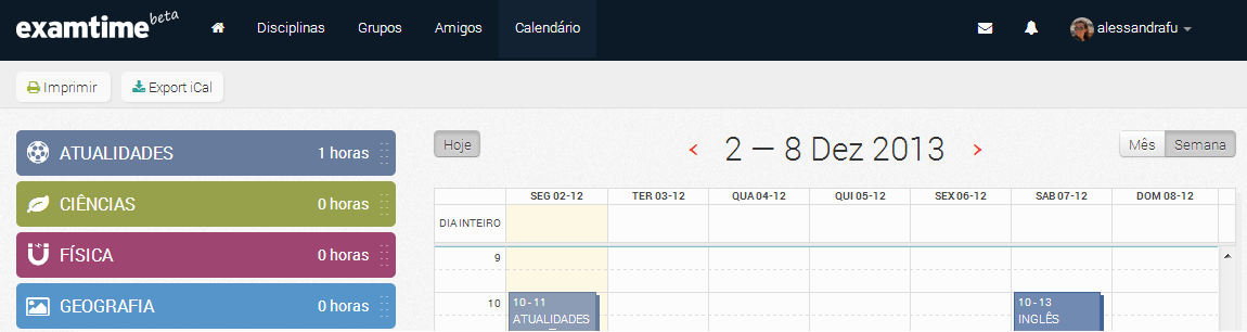 O calendário vai abrir sempre no modo semanal. Isto irá mostrar a semana atual com o dia atual em destaque (amarelo no fundo).Ao longo do lado esquerdo da página, você verá uma lista de todos as suas diciplinas. Se você não tem quaisquer disciplinas criada ainda você pode ir a página principal e inclui-las.Na vista semanal, você verá duas linhas azuis – estes marcam os momentos mais ativos do dia para você. Estes são definidos entre 07h30 – seis horas por padrão e pode ser editado para atender às suas necessidades individuais.No canto superior direito, você pode alternar entre a visualização semanal e mensal.