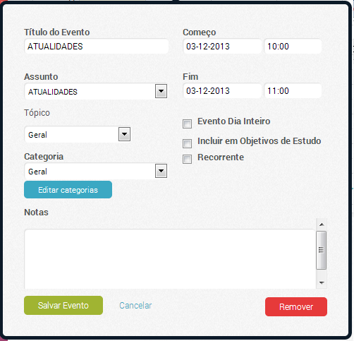 Quando você incluir uma disciplina no calendário online, você poderá utilizar as seguintes funções: Quanto tempo vai durar. Você precisa digitar um horário de início e fim. Se você quer mudar o nome do evento. Por exemplo, se você não quer apenas ver um bloco ‘ENEM’ você pode renomeá-lo como “Estudo Temas” ou “rever resumos”. Se ele vai aparecer em sua Linha do tempo ou será um evento privado. Se este evento se repete a cada semana ou se é apenas aquele dia. Qual categoria a que pertence, por exemplo, classe, em tempo livre, trabalhos de casa. Incluir qualquer observação sobre o evento! Estas são todas as opções, mas uma das mais úteis é a opção ‘recorrente’. Ao clicar neste permite definir se o bloco estudo particular repete a cada dia, semana, mês ou ano. Esta pode ser uma economia de tempo valioso e ajudar a planejar o seu estudo mais rápido e mais fácil a longo prazo.