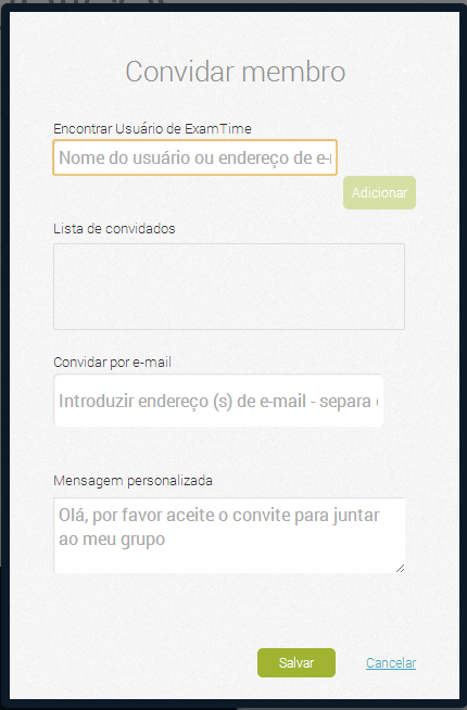 Ao criar o Grupo você pode começar a convidar pessoas para ele. Clique no botão "convidar".Um janela nova aparecerá e você pode convidá-los pelo nome de usuário no ExamTime ou pelo email. Personalize a mensagem que será enviada para que o usuário saiba do que se trata.Clique em "SALVAR". Os usuários listados receberão o convite para participar do Grupo.