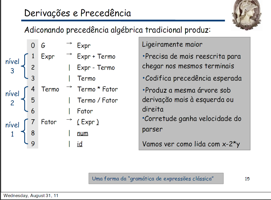 Resolve o problema da ordem em que os numeros e suas operações são interpretados pela gramática, ou seja: Primeiro consome os parenteses (nível 1) Multiplicação e divisão (Nível 2) Soma e subtração (Nível 3) http://www.dcc.ufrj.br/~fabiom/comp20112/03Parsers.pdf