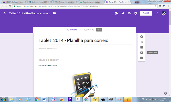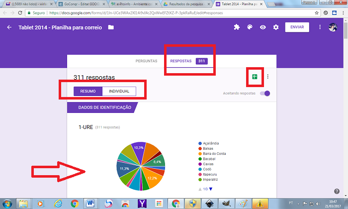 Uma das ferramentas mais úteis do Google Drive, ainda que pouco conhecida, é o gerador de formulários. Essa opção facilita a criação de questionários, pois automatiza o processo de design da página e traz vários estilos de perguntas pré-construídos. A ferramenta de formulários do Google Drive é bem versátil e pode ser usada para construir avaliações de algum produto ou serviço, cadastros de pessoas, pesquisas de opinião e até mesmo testes de conhecimento. Aprenda a criar um formulário assistindo ao vídeo 1 e vídeo 2 e, em seguida, faça a atividade solicitada.COMO VISUALIZAR AS RESPOSTAS DO FORMULÁRIO NA PLANILHA GOOGLE1-Na página de edição do formulário (IMAGEM 1), você verá 2 abas na parte superior : PERGUNTAS e RESPOSTAS. Na aba PERGUNTAS você cria e edita as perguntas como quiser. Na Aba RESPOSTAS você terá acesso as respostas (resumo geral ou individual) enviadas por quem respondeu o seu formulário (IMAGEM 2).2-Na aba RESPOSTAS (IMAGEM 2), você terá acesso a várias informações, dentre elas a criação automática de vários gráficos já montados com a síntese das respostas recebidas.3-Para visualizar a planilha com TODAS as respostas recebidas , clique no ícone VERDE (ver respostas na planilha) , localizado ao lado direito da aba RESPOSTAS (IMAGEM 2).Caso você não tenha criado essa planilha, o sistema lhe perguntará se gostaria de criar uma, basta apenas confirmar clicando na opção que aparecer.4-Ao abrir a planilha (IMAGEM 3) você verá todas as informações em uma tabela. Você poderá utilizar a ferramenta FILTRO para selecionar algumas informações ou criar novos gráficos com novas informações selecionadas.